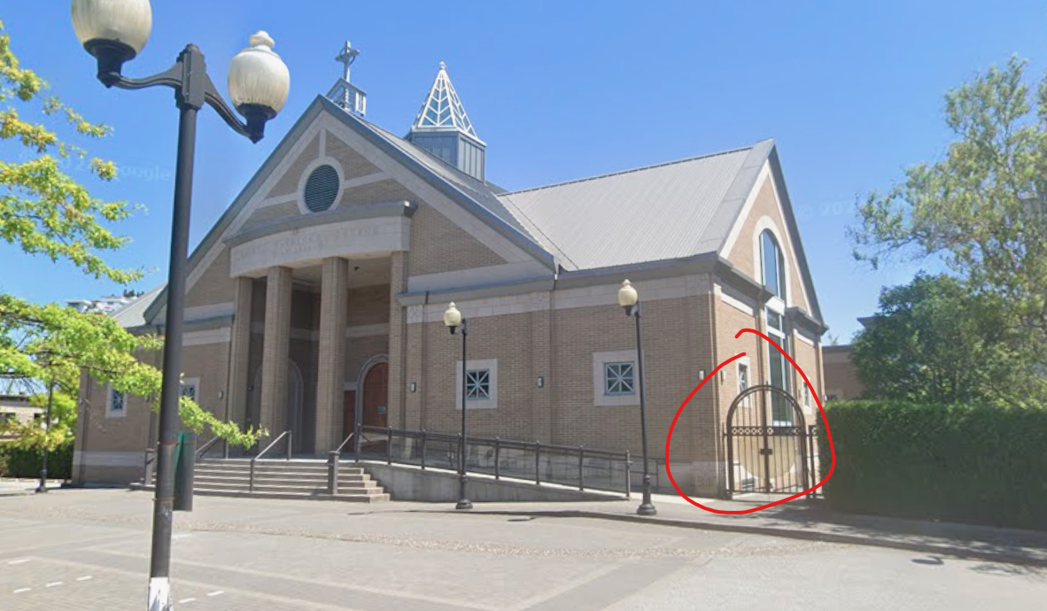Enter through the gate on the right side of the church doors, at the bottom of the ramp. Proceed down to the bottom of the stairs and turn left into the entrance.